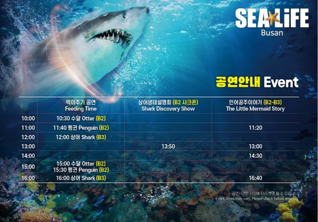 그 외에도 다양한 포토존에서 사진 촬영 및 펭귄 먹이 주기 체험, 상어 먹이주기 체험, 해양 탐험선 체험, 인어공주 공연 등 다채로운 관람거리와 체험을 즐길 수 있습니다.