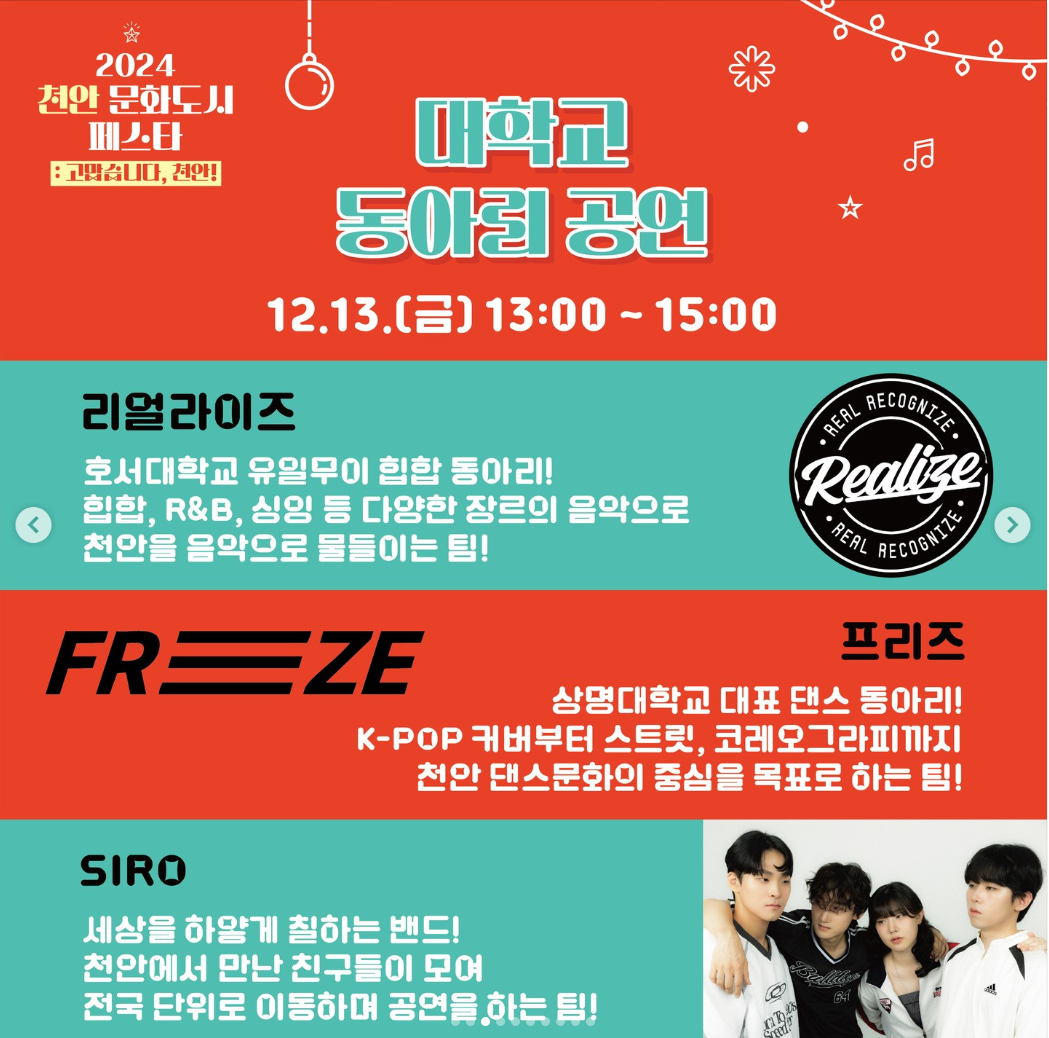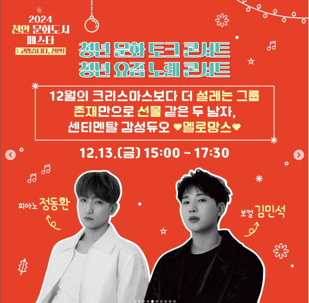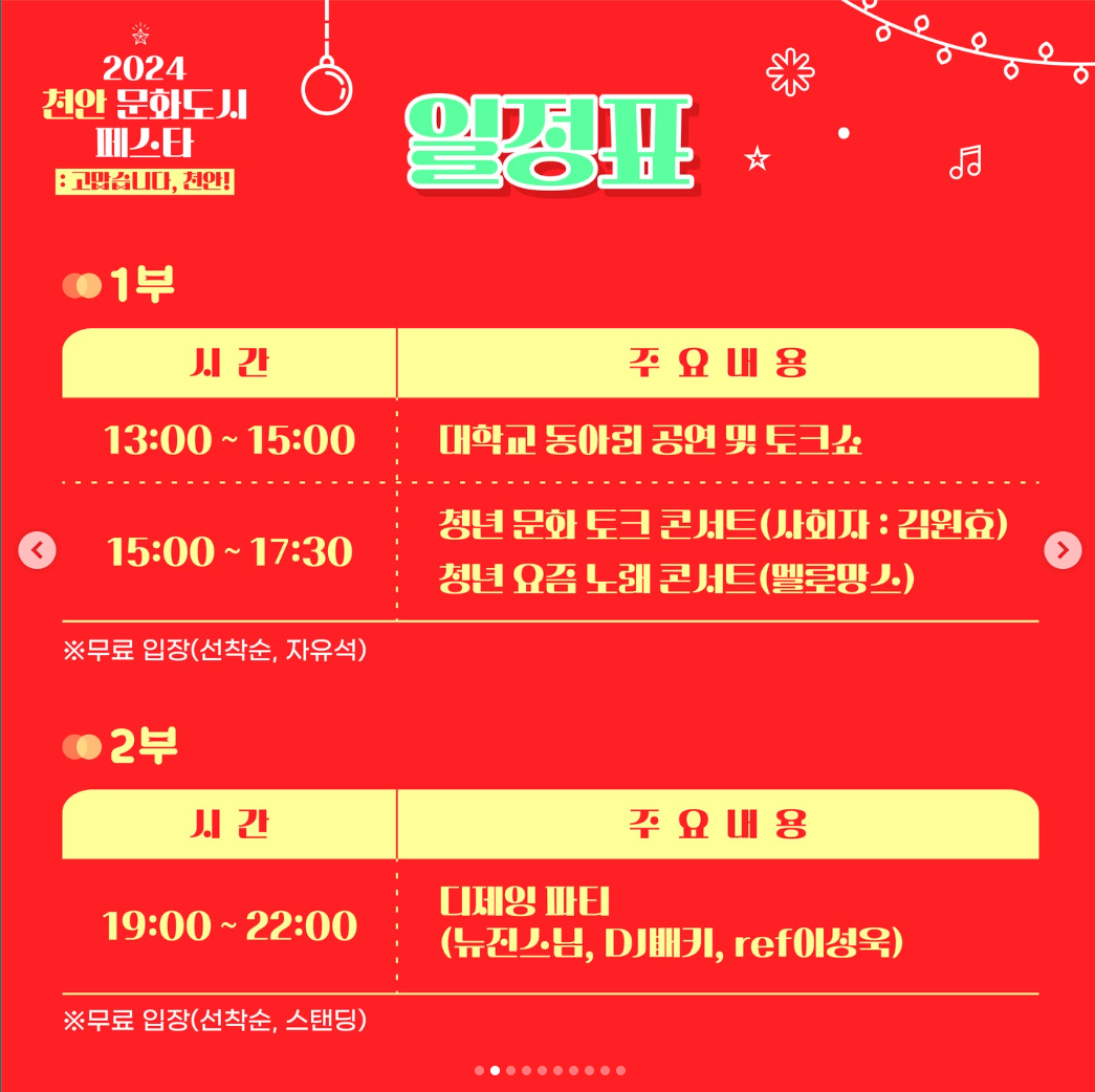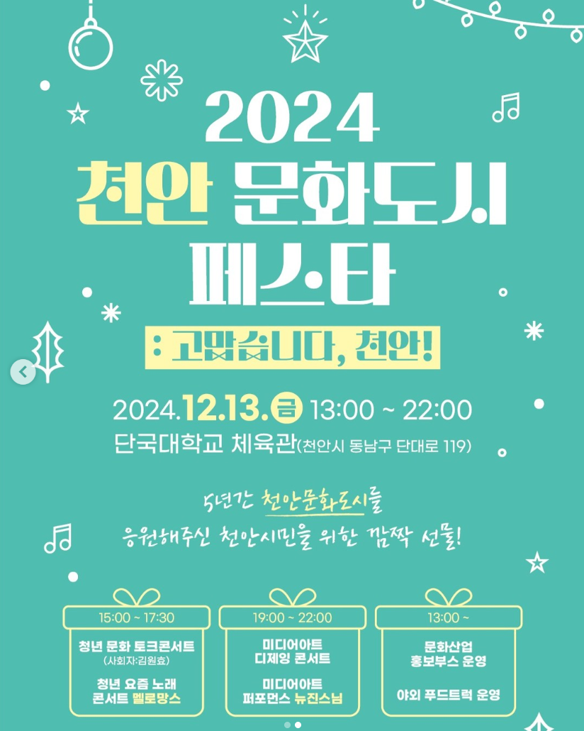 천안문화도시 5개년 사업 성과를 시민들과 공유하고, 포스트 문화도시의 주요 사업을 홍보하기 위해 개최된 축제입니다. 또한, 충남의 대학생, 예술인, 기업, 크리에이터들이 부스를 운영하여 풍성한 볼거리를 선보일 예정입니다. 그 외에도 청년 문화 토크 콘서트, 가수 멜로망스와 대학생 동아리와 함께하는 음악 공연, DJ 뉴진스님과 함께하는 미디어아트, 디제잉 파티 등 다채로운 문화 행사가 펼쳐질 예정입니다.